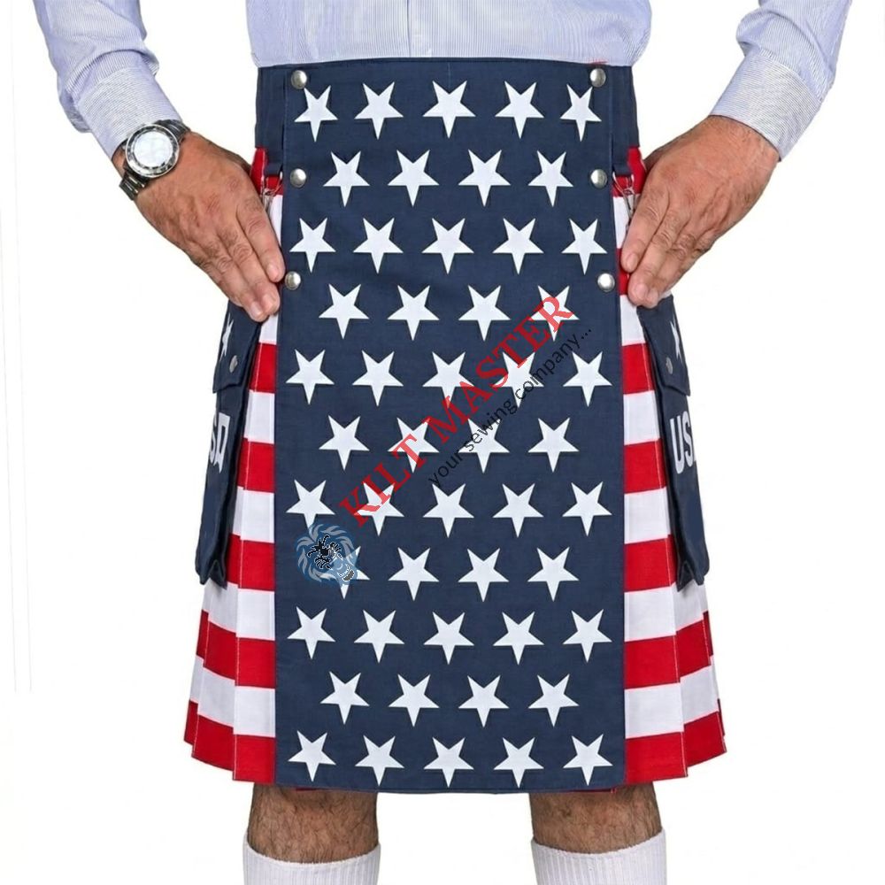The American Flag Utility Kilt for Men is made of soft, durable cotton. This fabric feels comfortable on the skin and is easy to wash. The cotton material makes the kilt lightweight yet sturdy, perfect for wearing at events or on casual days. Its high-quality construction ensures the kilt will last through many uses. The patriotic design with the USA flag pattern adds a bold, stylish touch to your wardrobe. Whether you're celebrating Independence Day or showing patriotic spirit any day, this utility kilt is a great choice.