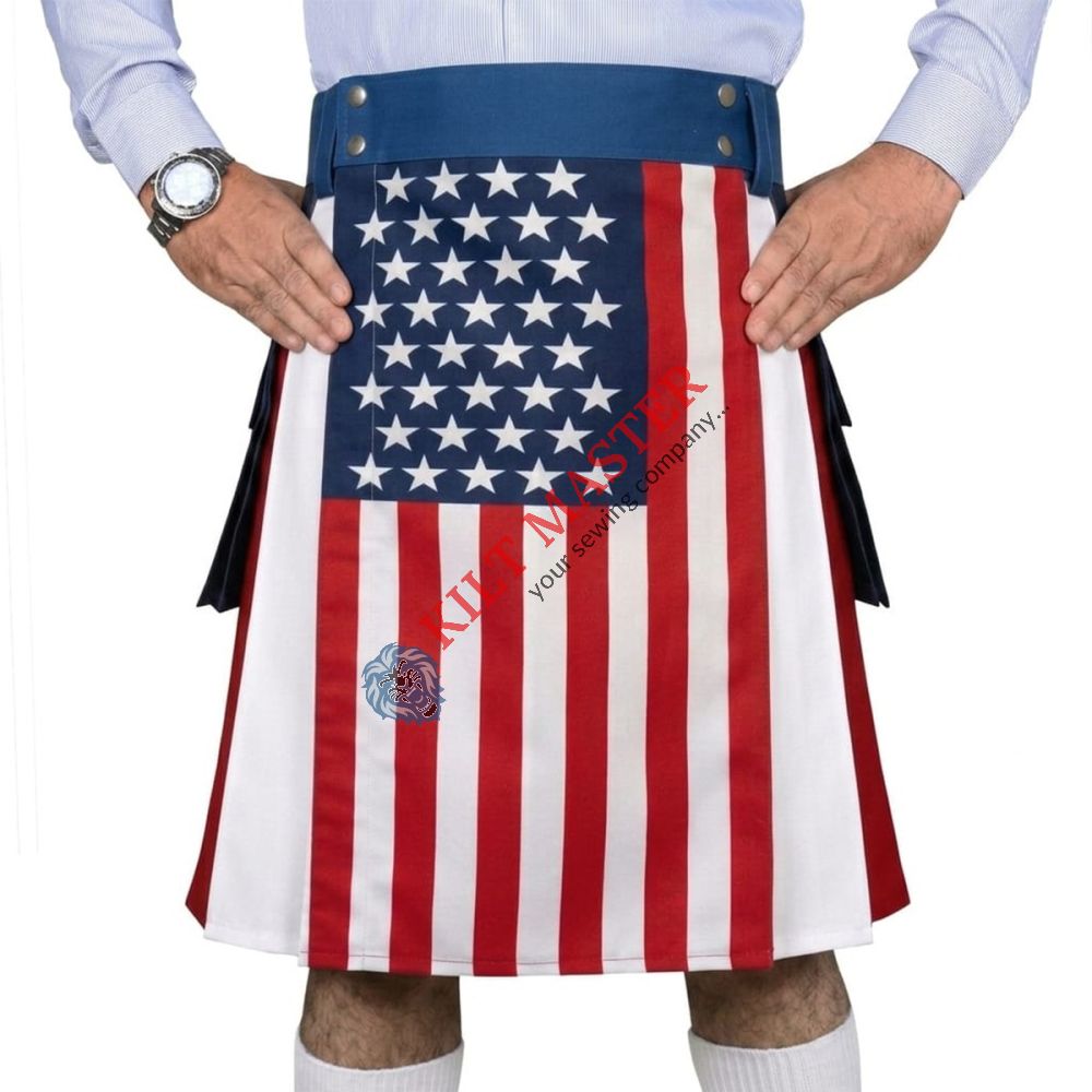 An American Flag Utility Kilt is a stylish piece of clothing inspired by the American flag. It is designed with patriotic colors and patterns. The kilt is practical and durable, often used for events or shows that celebrate American pride. Made with tough materials, it has pockets and features that make it easy to carry small items. This kilt is perfect for anyone who loves America and wants to wear their pride proudly. It combines fashion and function for a comfortable, eye-catching look that shows off your patriotic spirit.