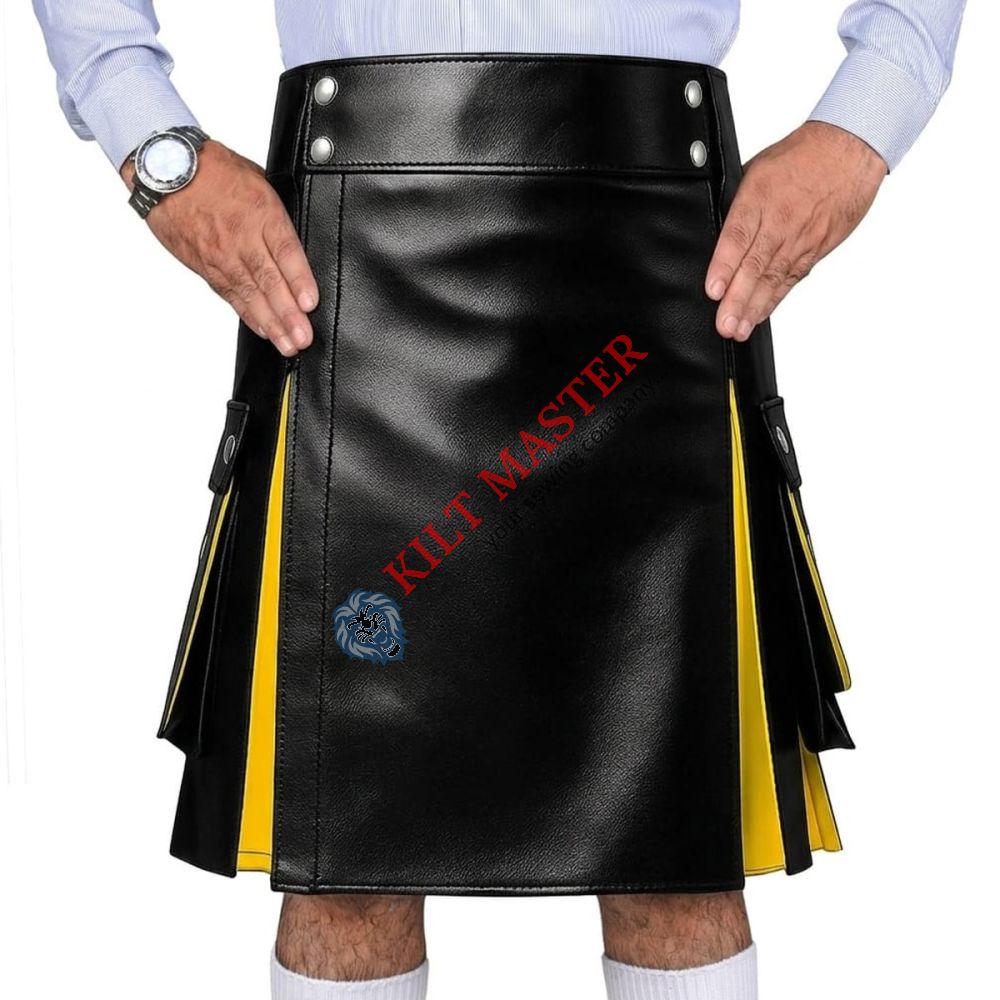 The Black and Yellow Leather Utility Kilt is a bold statement piece crafted from high-quality genuine leather for durability and long-lasting comfort. Featuring a sleek black base with vibrant yellow accents, it delivers a modern and eye-catching look. Designed with stylish pleats and spacious cargo pockets, it combines fashion with everyday practicality. Ideal for biker wear, festivals, and casual outings, this kilt offers a perfect blend of rugged style, premium quality, and a confident masculine appeal.