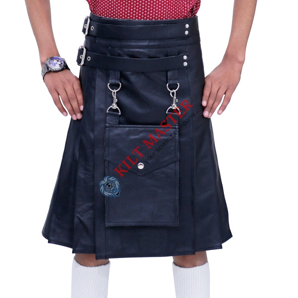 This Black Leather Kilt with Detachable Front Pocket is stylish and strong. Made for comfort and easy use. Great for casual wear or events. Perfect kilt for men who love bold style.