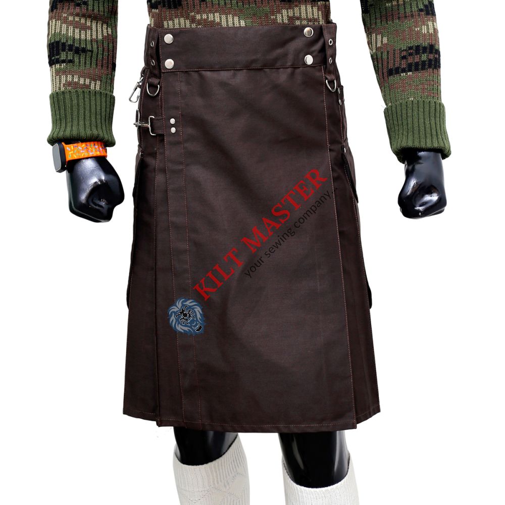 Material: 100% Heavy-Duty Cotton Fabric: Drill Jeans Color: Dark Brown Style: Utility Type: Working Kilt Side Pocket: Round with Button Fastening Fastening: Buttons Decorated: Belt Loops Hardware: Select Your Option Size: Made to Order