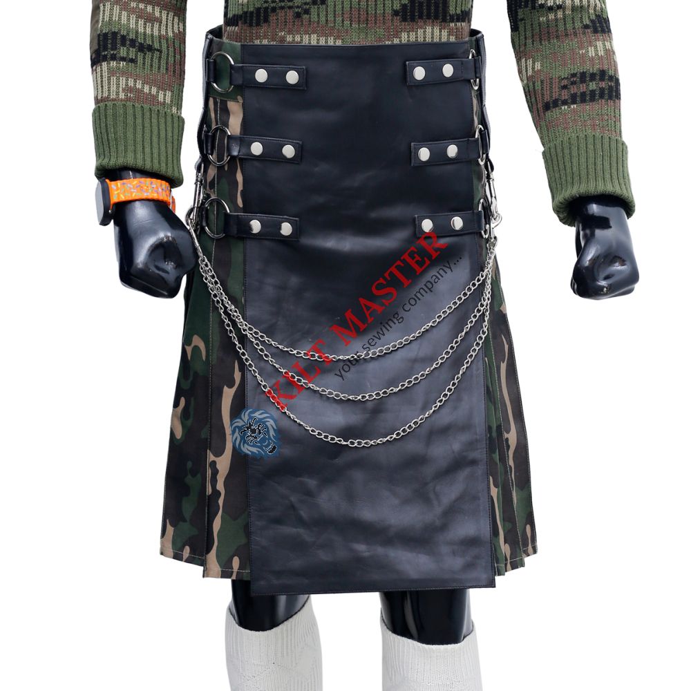 The Fashion Camo Kilt with Leather Apron is a stylish and bold kilt for men. It features a cool camouflage pattern with a sleek black leather front, perfect for casual wear or special events.