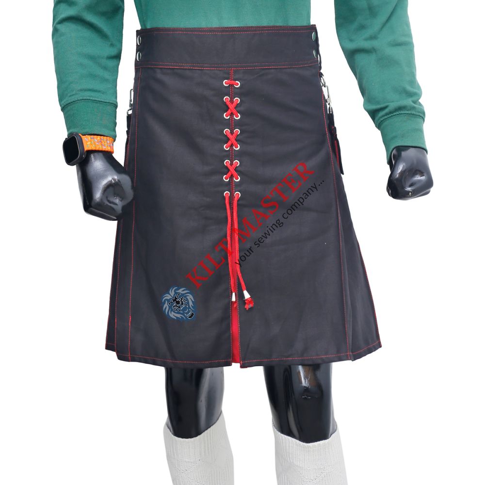 Black and Red Hybrid Kilt designed for those who embrace modern style and functionality, this kilt blends premium quality with a striking look. Made from 100% cotton drill jeans fabric, it combines black and red panels for a striking appearance. Ideal for any event or daily wear, the utility-style kilt features side pockets with button fastening and belt loops for added convenience.