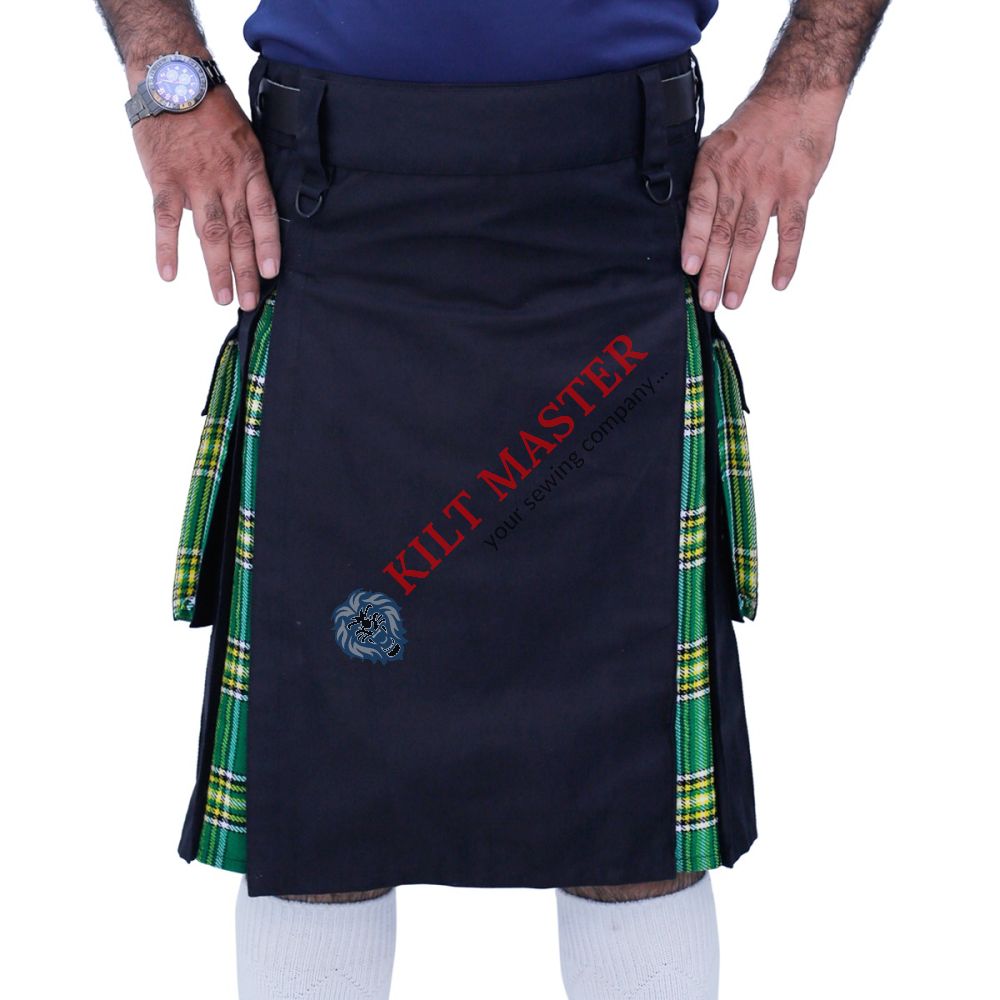 A Hybrid Kilt Black and Irish Green is a stylish modern kilt designed for adults. It combines traditional Scottish styles with a contemporary look. The black and Irish green colors add a bold touch, making it perfect for special occasions or everyday wear. This kilt features Irish green accents that give it a unique, eye-catching appearance. It is made to measure, ensuring a perfect fit for each person. Whether you want a men's fashion kilt or something different, this hybrid kilt is versatile, easy to wear, and always fashionable.
