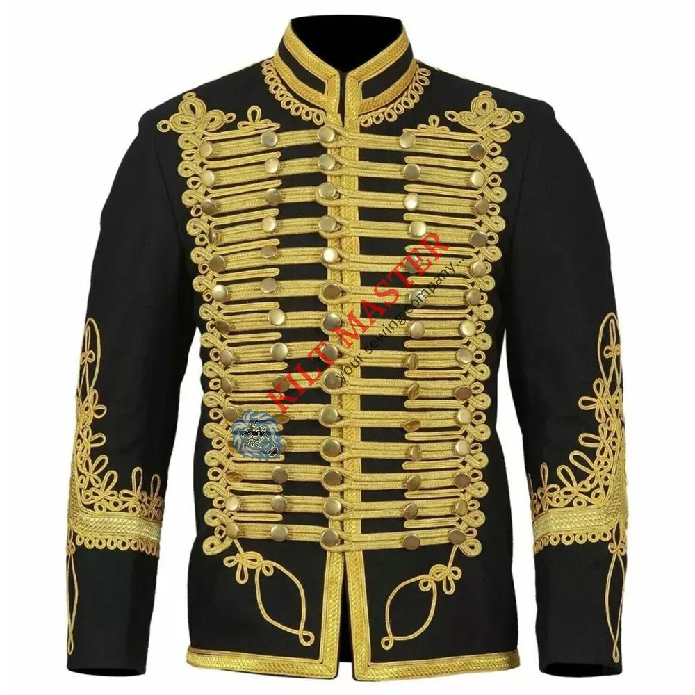 Fabric: Black Wool Accents: Gold Braid Style: Hussar Type:Doublet Jacket Fit: Tailored Design: Classic Military Look Closure: Front Buttons Adjustability: Custom Fit