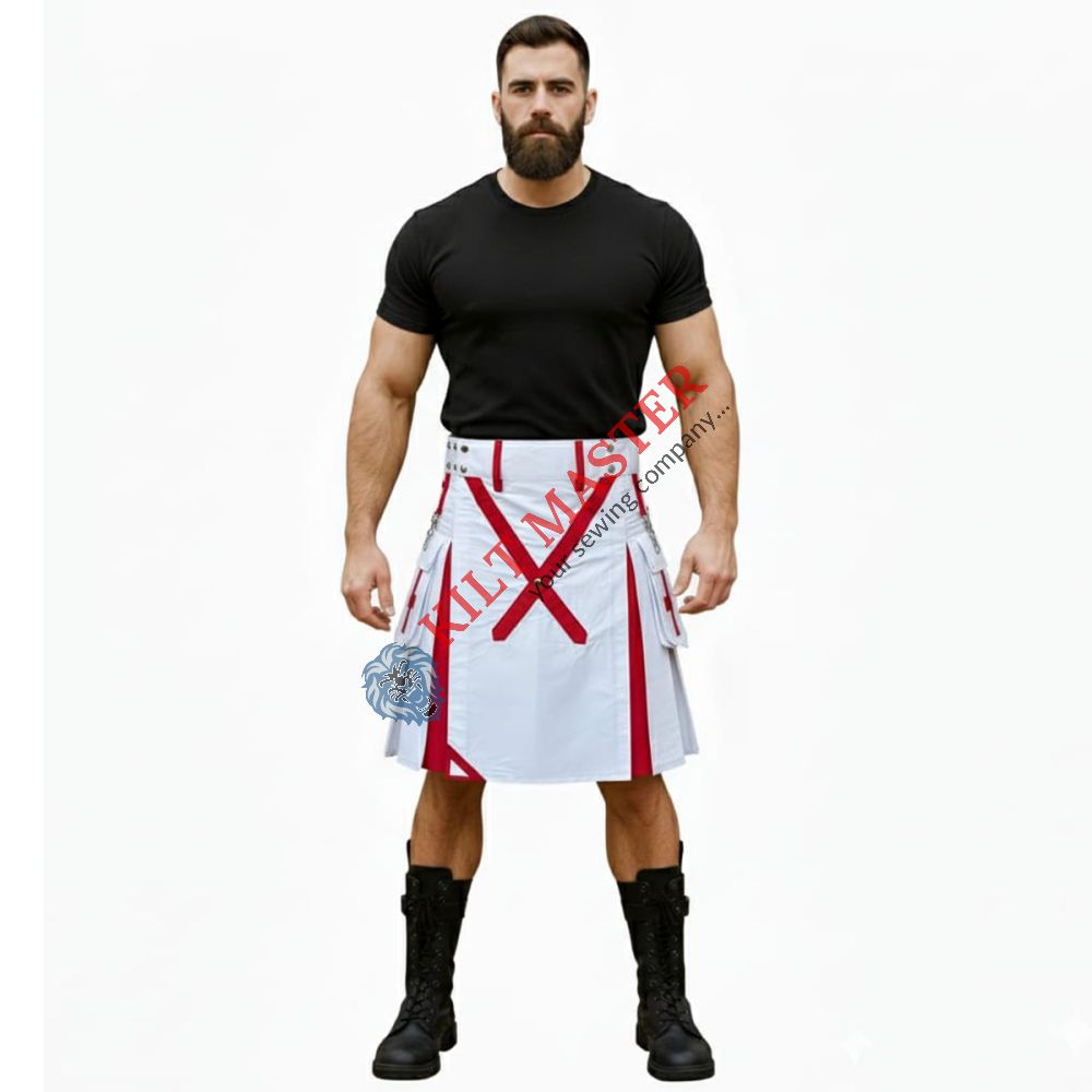 The White and Red Christmas Utility Kilt is a festive, stylish kilt designed for the holiday season. It features bright red and white colors, perfect for holiday parties and events. Made from durable materials, this utility kilt offers comfort and style, making it a great choice for men who want a fun, seasonal look. It’s inspired by traditional Scottish kilts but adds a modern twist with holiday colors, making it ideal as a men's Christmas kilt or a festive holiday kilt for celebrations.