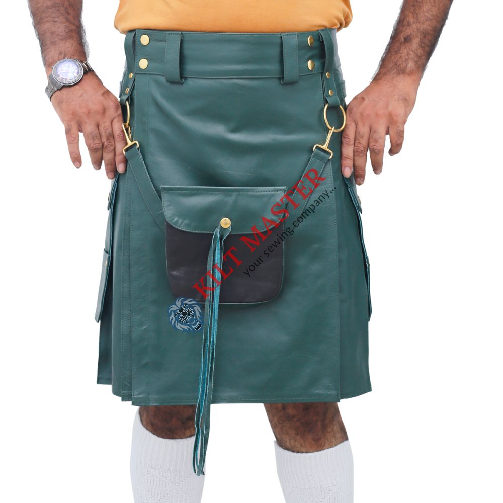 This kilt features durable leather with an adjustable fit for comfort. Functional pockets add convenience, while its bold green design makes it perfect for festivals, casual wear, and standout style.