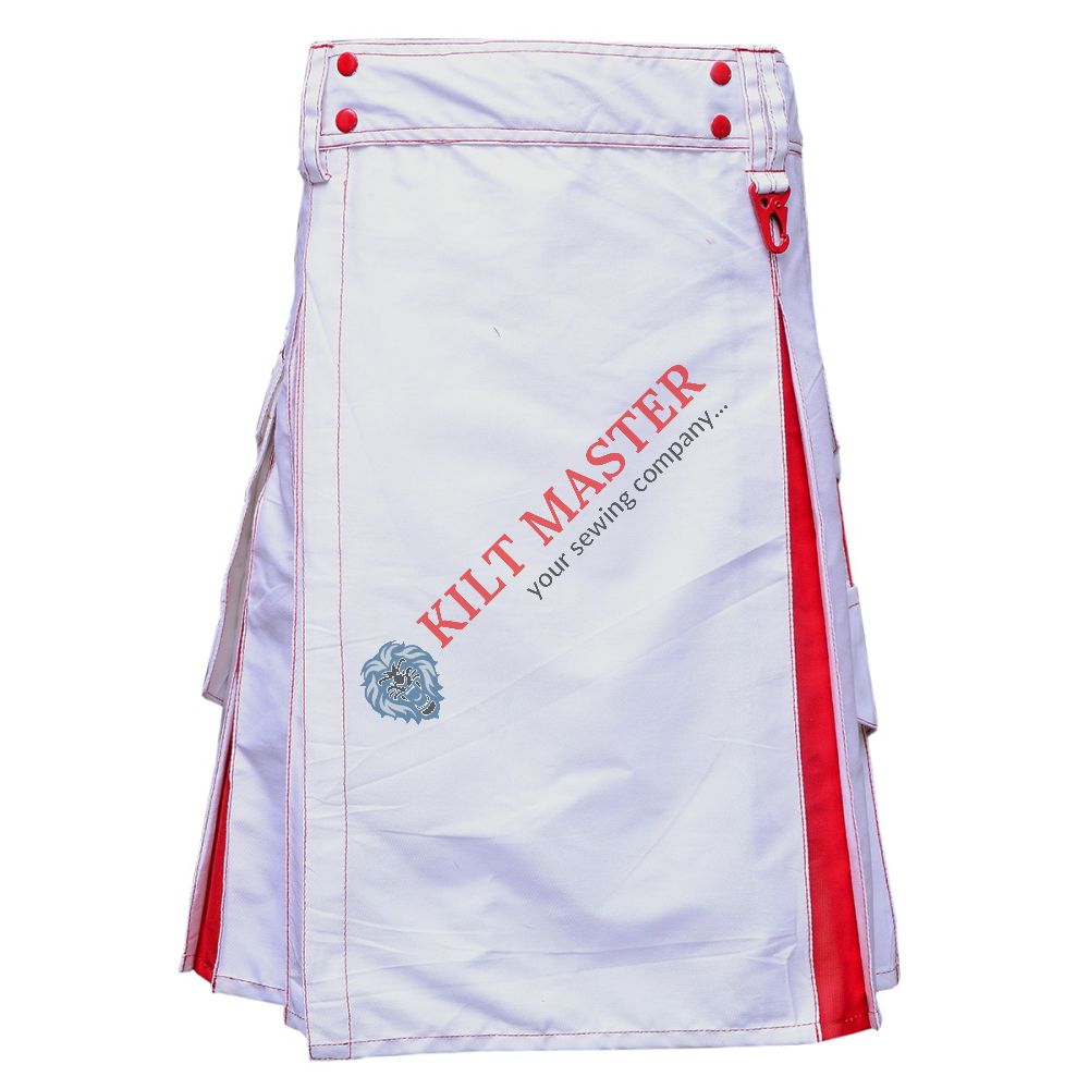 Experience the perfect blend of tradition and comfort with our White and Red Hybrid Utility Kilt, featuring adjustable straps and spacious pockets for practical use.