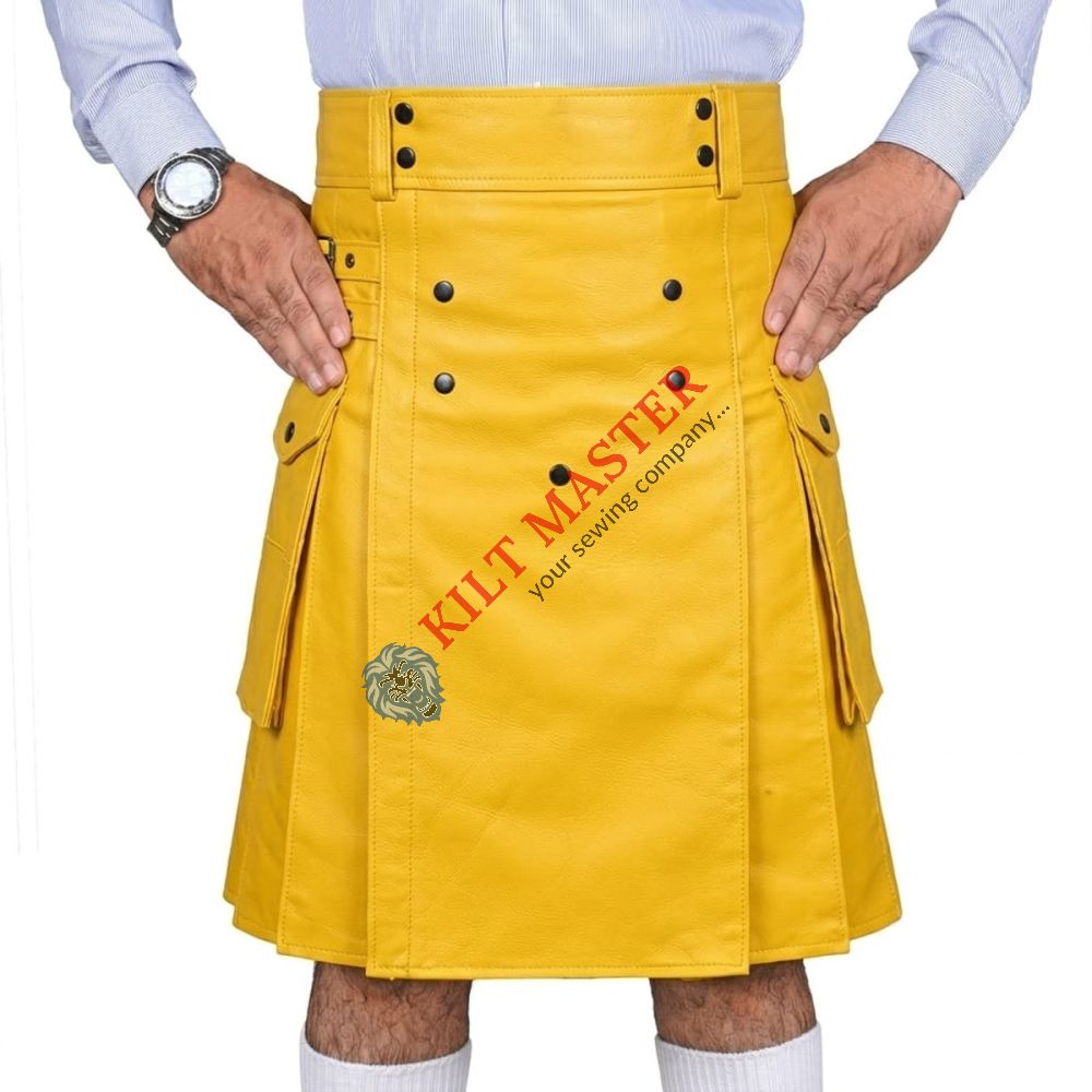 Yellow Leather Utility Kilt is stylish, durable, and modern. Made from high-quality leather, it offers comfort, strong fit, and bold look. Perfect for events, casual wear, and fashion lovers.